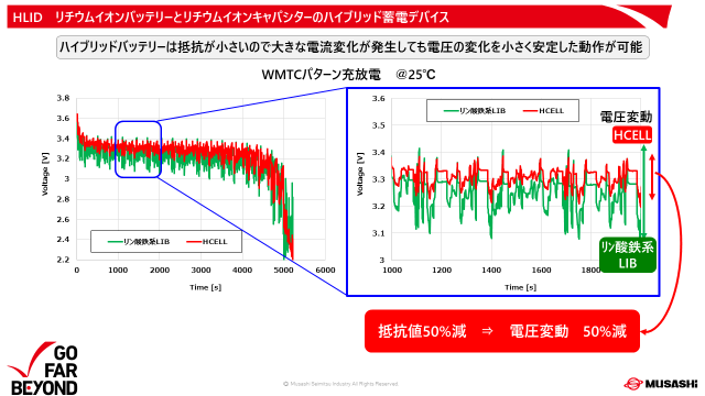 HLID内のハイブリッドセルには、リチウムイオンキャパシタと共通している電圧範囲が広いリン酸鉄バッテリーを使います。リチウムイオンキャパシタの電圧範囲が2.2~3.8Vに対して、リン酸鉄バッテリーは2V~3.6Vとなります。あと希少材材料を使用していないので、価格や入手性といった面で優位性があります。