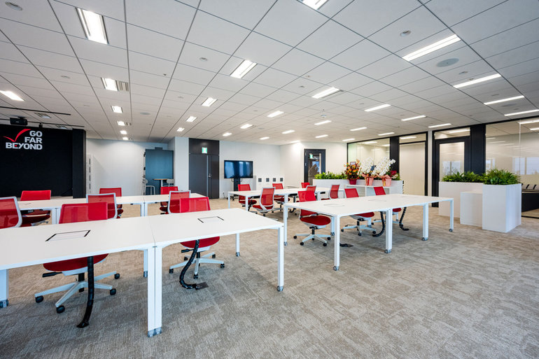 また、オフィス内にはイベントや会議に利用できるステージを設置。国内外から訪れる顧客、投資家、メディア、そしてムサシの将来を担う人材との交流拠点として活用します。愛知県豊橋市に本社を置く企業としては先駆的に東京拠点を構え、日本全国はもちろん世界からの優れたグローバル人材確保にもつなげてまいります。
